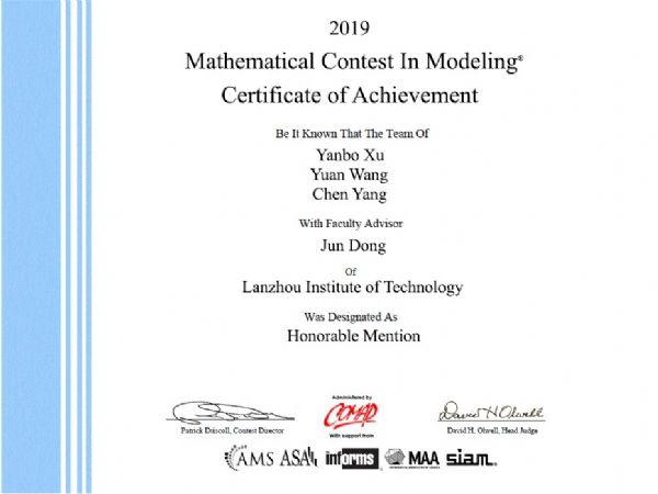 日前,2019年美国数学建模竞赛成绩揭晓。由我校教师董珺指导的学生团队(电信16-1班许彦波、软件16-1王渊、软件16-1杨晨)获该项竞赛二等奖(Honorable Mention)。这也是我校首次组建团队参加美国大学生数学建模竞赛。